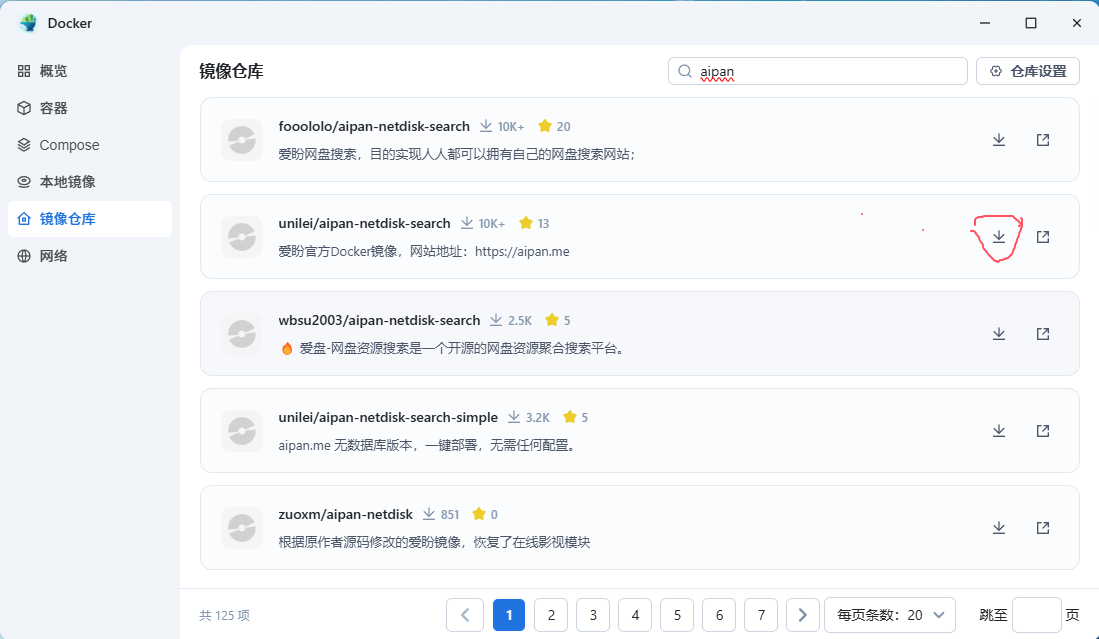 打开docker镜像仓库搜索aipan选择unilei/aipan-netdisk-search下载